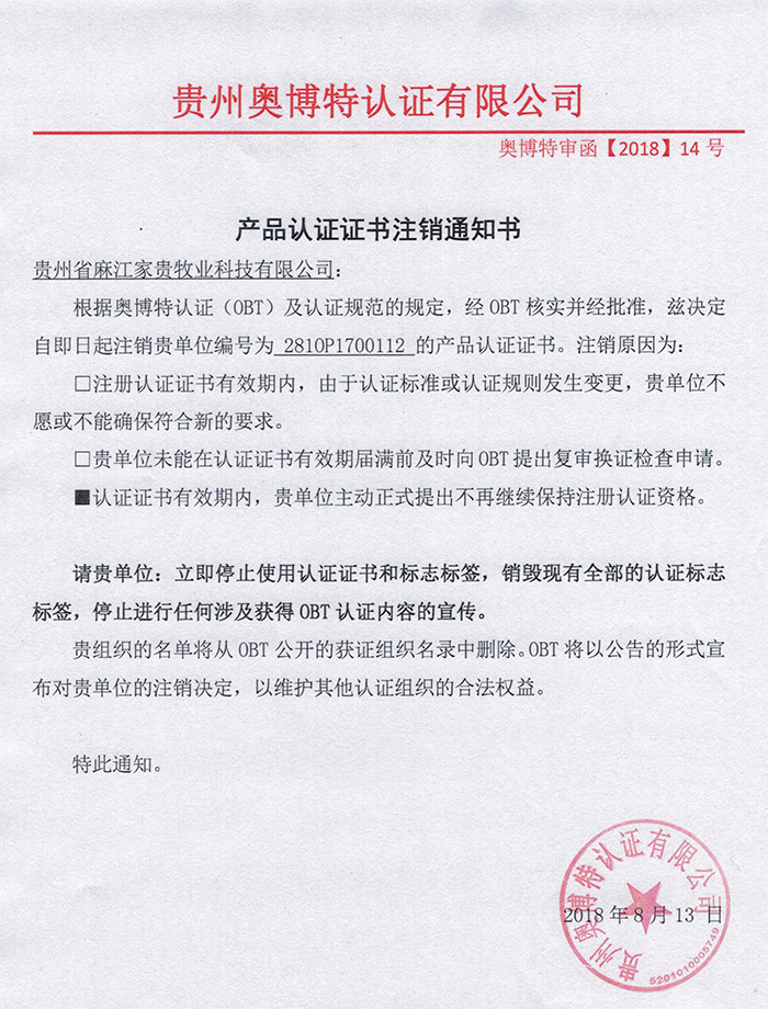 注銷貴州省麻江家貴牧業科技有限公司產品認證證書通知