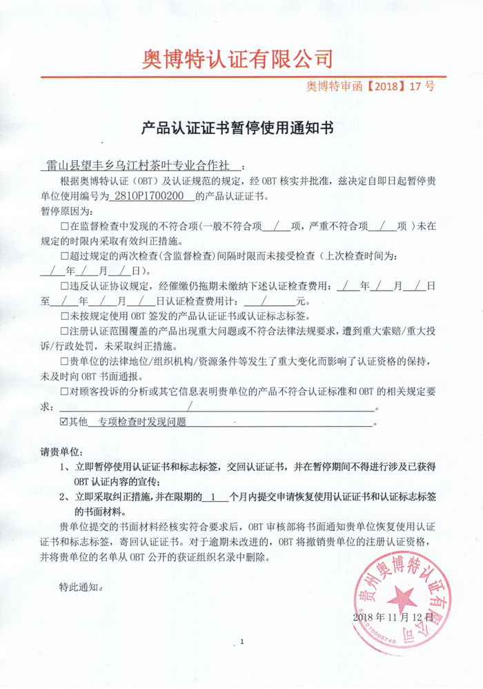 暫停雷山縣望豐鄉烏江村茶葉專業合作社產品認證證書使用通知書