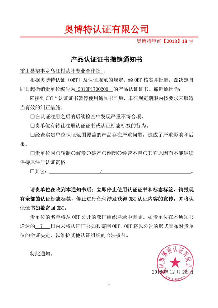 撤銷雷山縣望豐鄉烏江村茶葉專業合作社產品認證證書通知