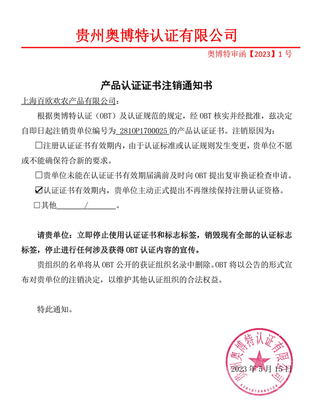注銷上海百歐歡農產品有限公司產品認證證書通知