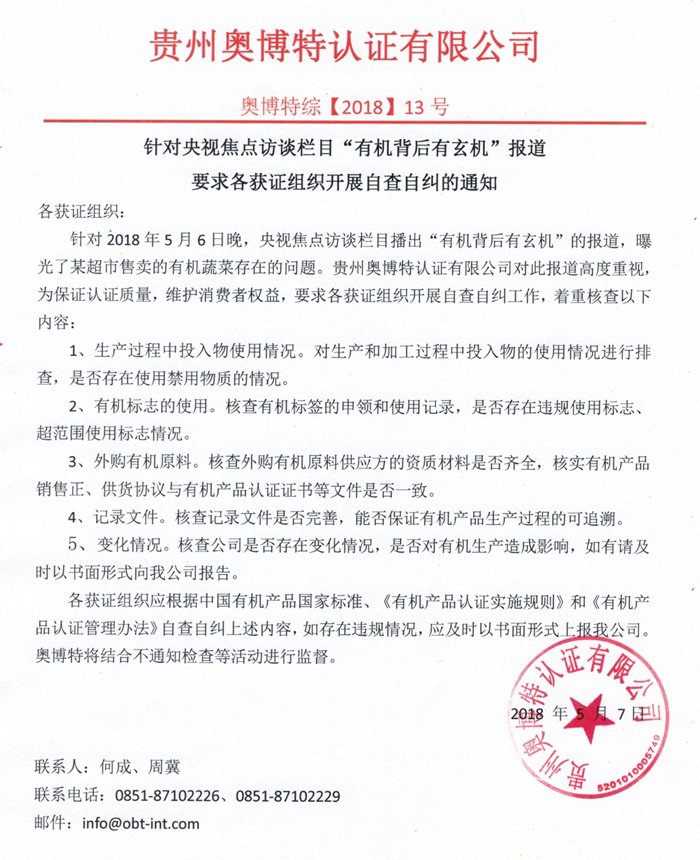 針對央視焦點訪談欄目“有機背后有玄機”報道 要求各獲證組織開展自查自糾的通知