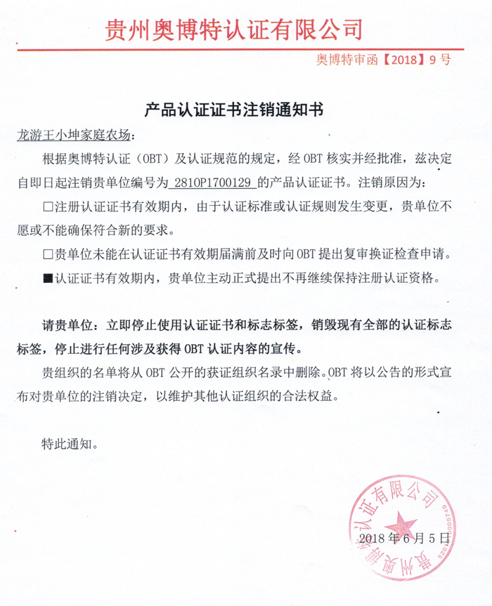 注銷龍游王小坤家庭農場產品認證證書通知